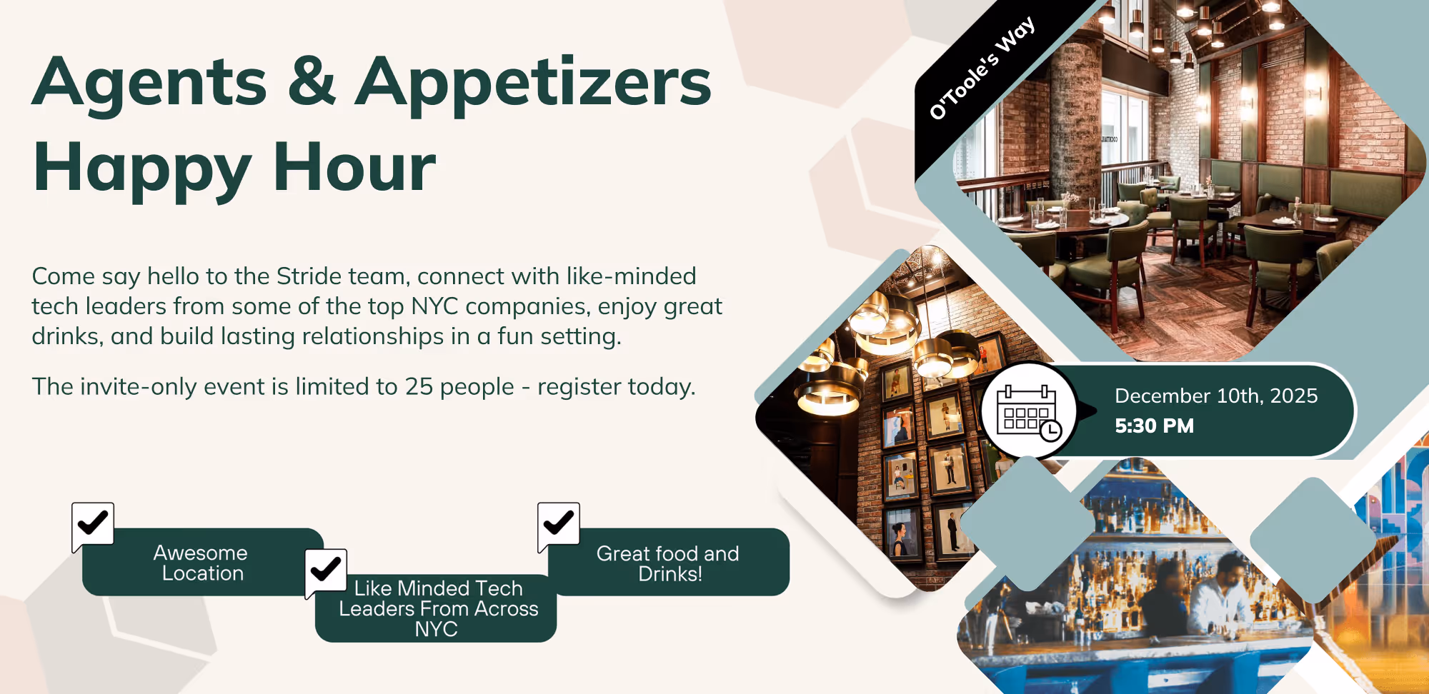 Join the Stride team and a small group of fellow tech leaders for a laid-back happy hour in the heart of NYC. This invite-only event is all about good drinks, good food, and even better company. Meet peers from leading companies, swap stories, share ideas, and grow your network — all in a casual, no-pressure setting.